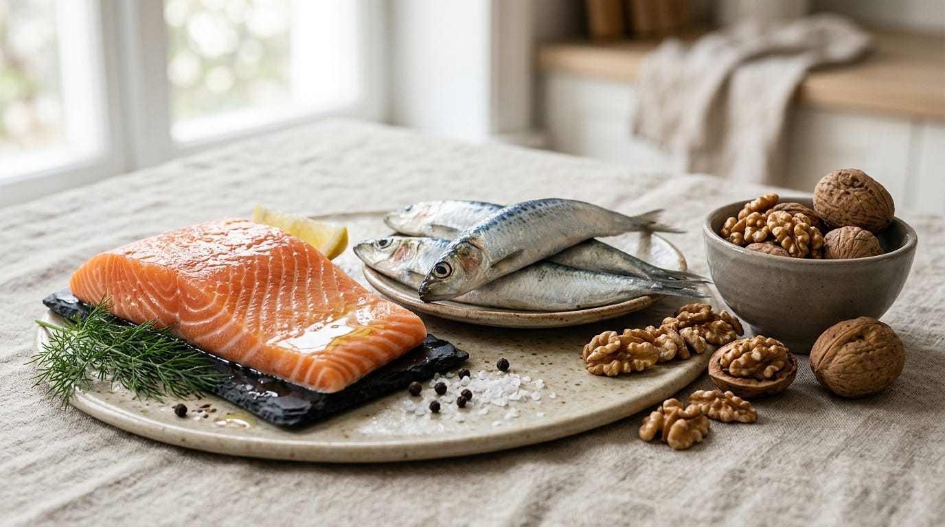 Salmon, sardines, walnuts