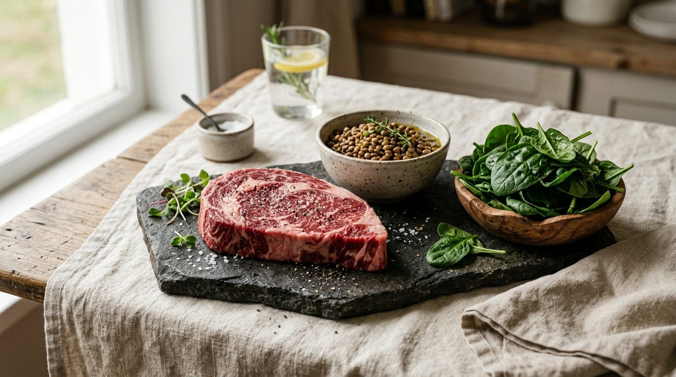 Red meat, lentils, spinach