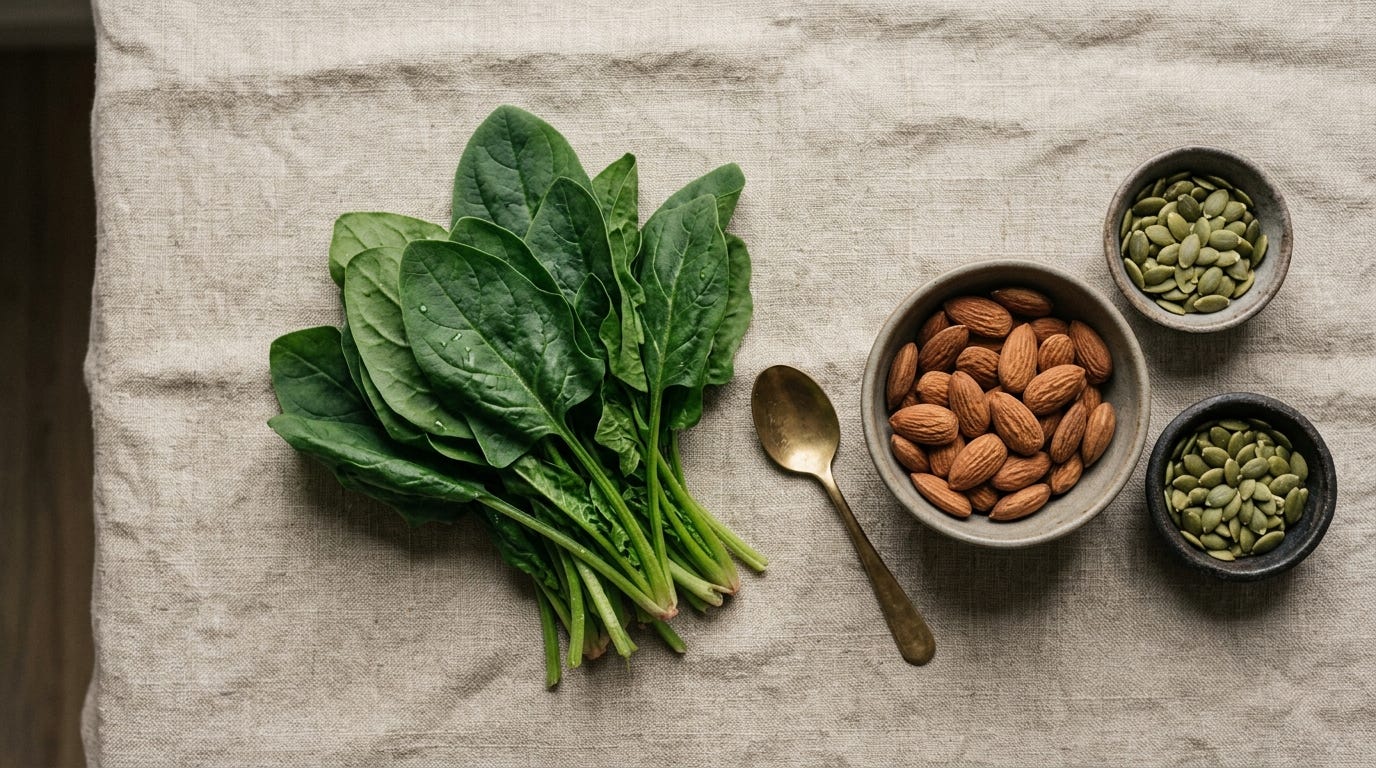 Spinach, pumpkin seeds, almonds