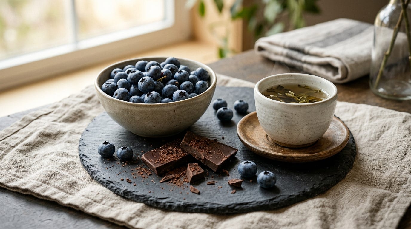 Blueberries, dark chocolate, green tea