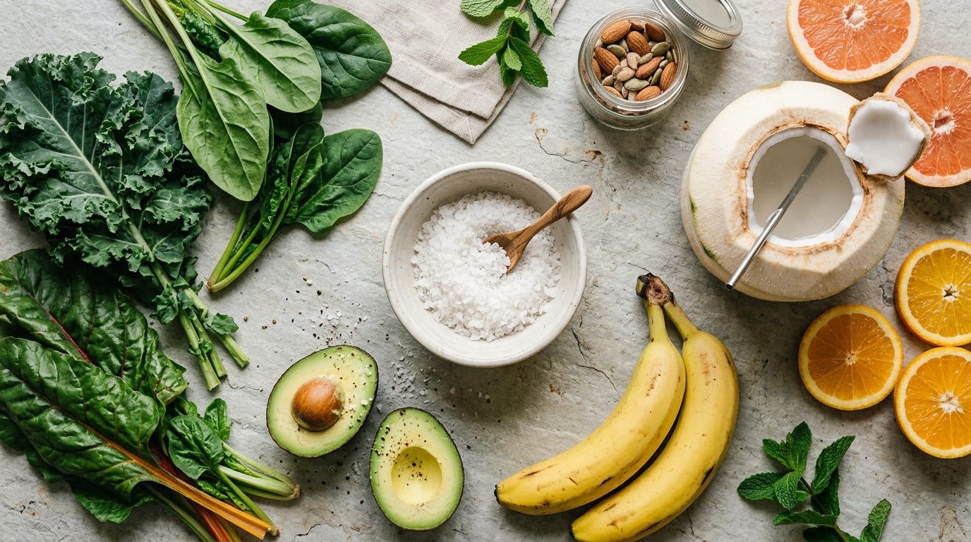 Start by supporting electrolyte balance through both sodium and potassium, which can be as simple as adding a pinch of mineral-rich salt to meals while also including fruits and vegetables that naturally provide potassium.