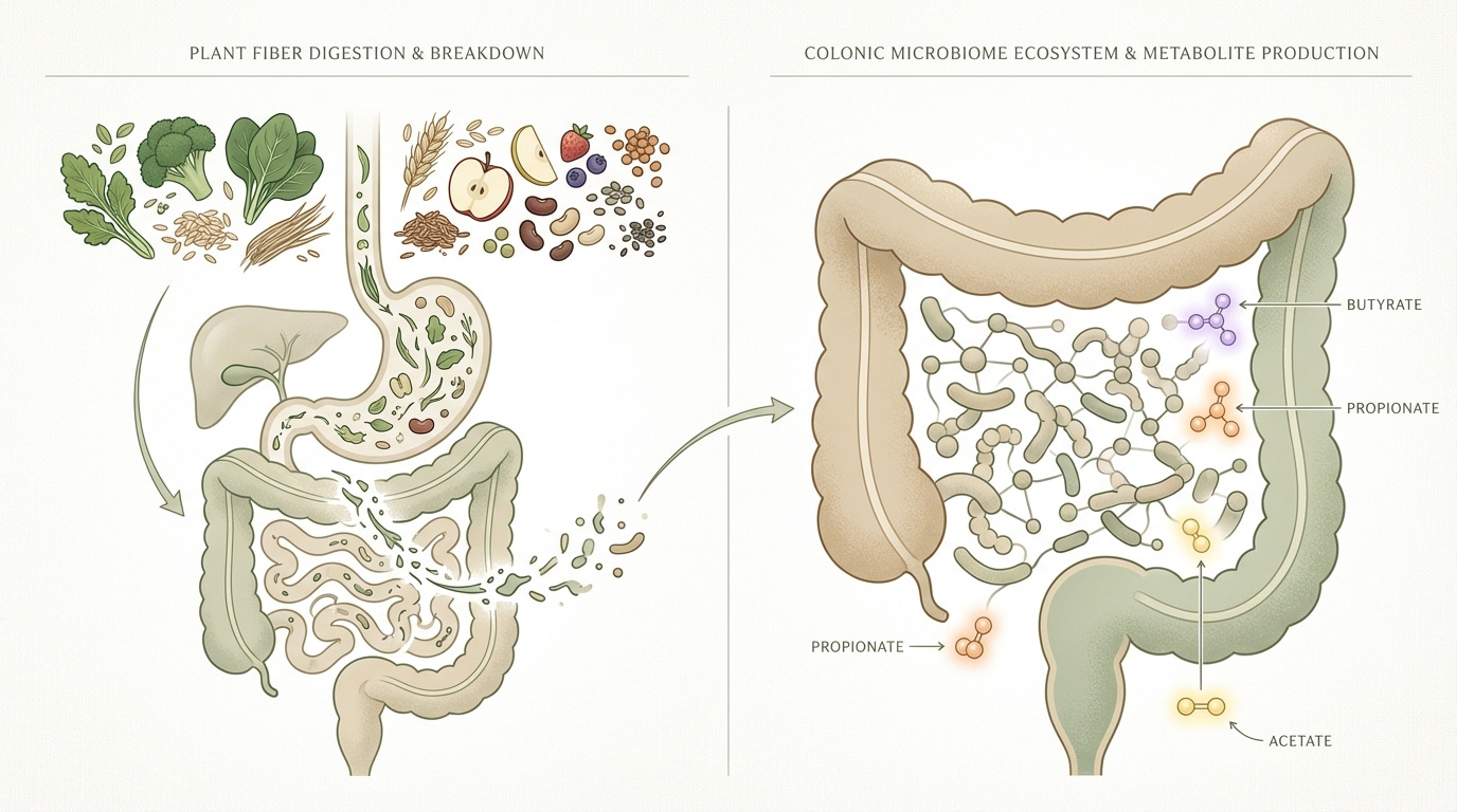 The gut microbiome is an ecosystem composed of trillions of microorganisms. These microbes rely on plant fibers as fuel. When fiber reaches the colon, bacteria ferment it and convert it into metabolic signals known as short-chain fatty acids.