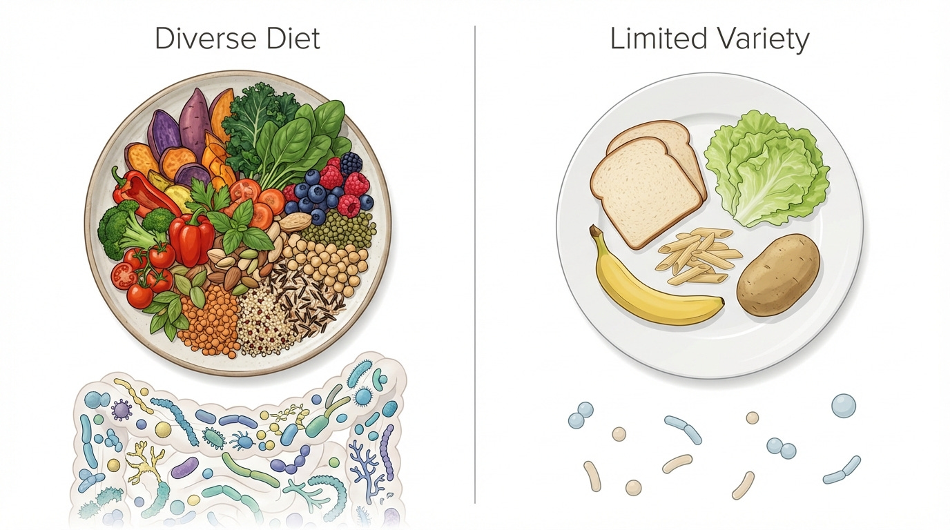 A diet providing 35 grams of fiber from one or two foods does not support the same microbial ecosystem as a diet providing the same amount from a wide range of plants.