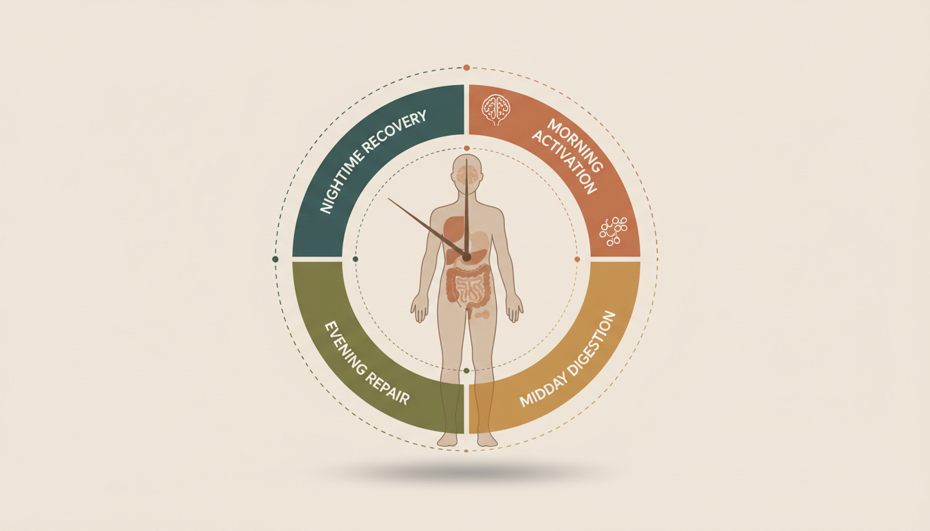 The body does not absorb, transport, or use nutrients evenly throughout the day. Digestion shifts. Hormones rise and fall. The nervous system moves between alertness and repair. What works well in the morning may be ineffective or even disruptive at night.